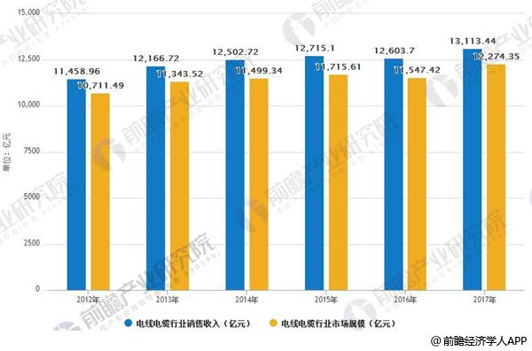 2012-2017年中国电线电缆行业销售收入、市场规模情况。数据来源:前瞻产业研究院整理