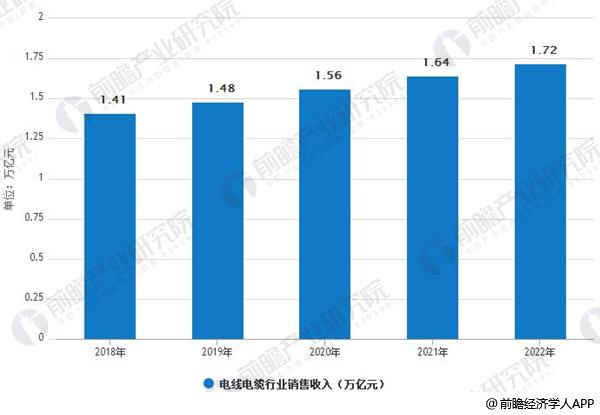 2016年,我国电线电缆行业销售收入达到1.26万亿元,到2017年则达到1.34万亿元。预计到2018年中国电线电缆行业销售收入将达到1.41万亿元,未来五年(2018-2022)年均复合增长率约为5.09%,2022年中国电线电缆行业销售收入将达到1.72万亿元。